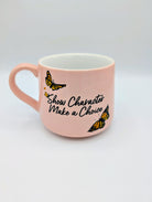 This 12oz crescent-shaped mug features our signature Blind Dog Coffee logo on one side and the empowering message “Show Character, Make a Choice” on the other, accented by vibrant monarch butterflies. The soft vintage pink glaze gives it a timeless, cozy feel—perfect for mornings that need a gentle start or afternoons that call for reflection.